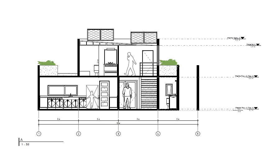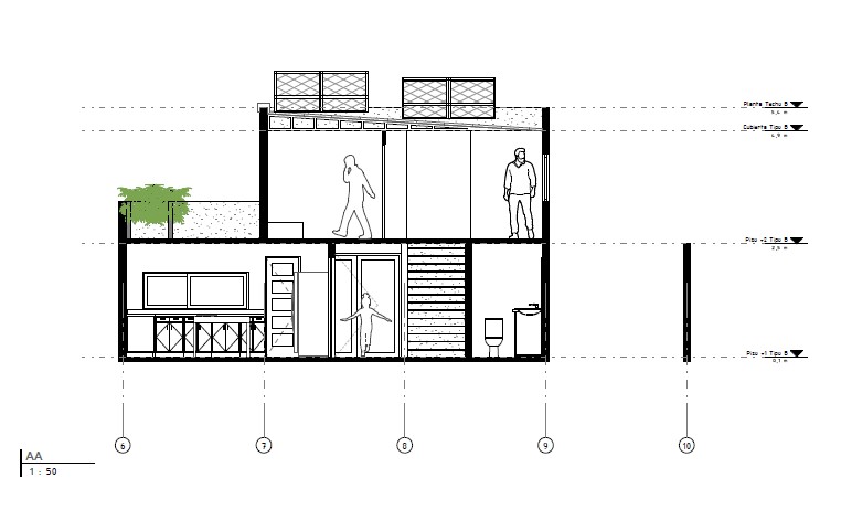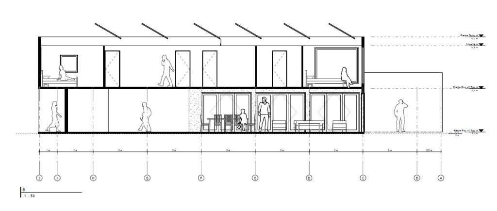 Primer Nivel: Zonas sociales abiertas (living-comedor, cocina integrada o semi-integrada) y servicios.