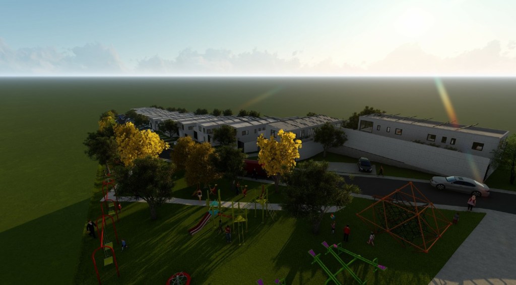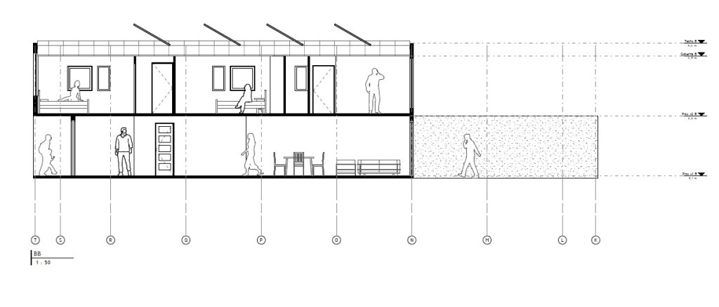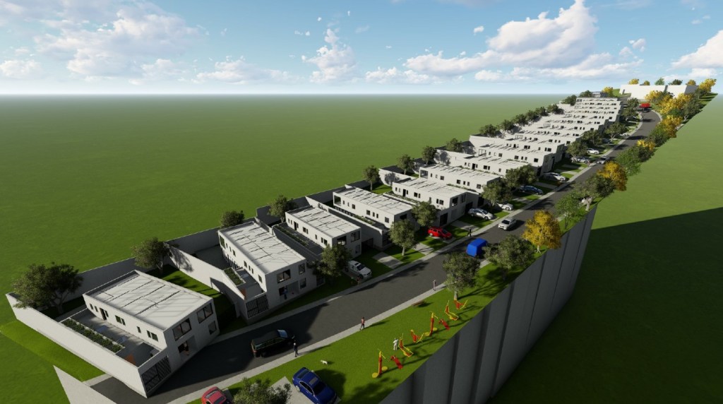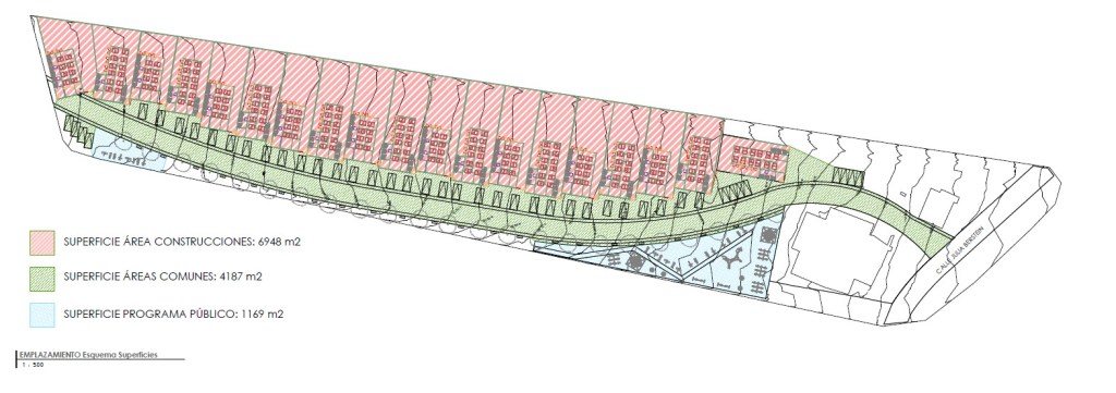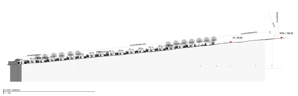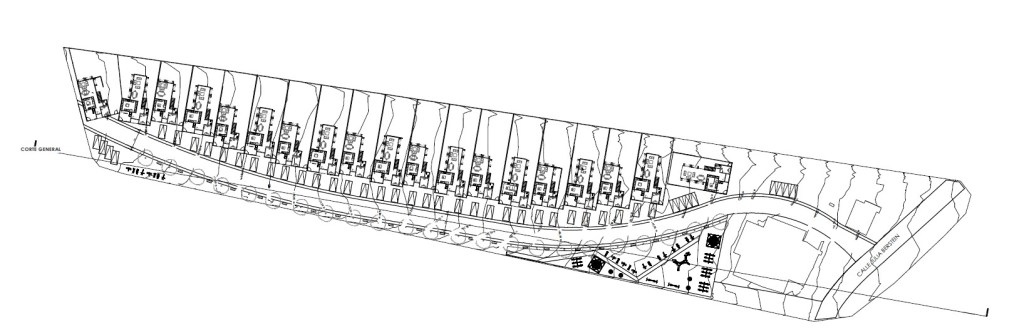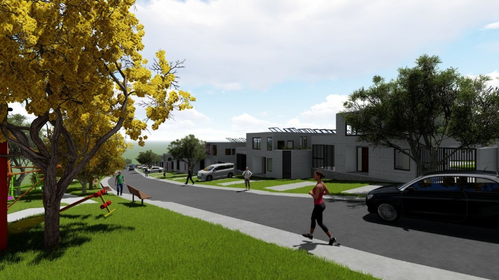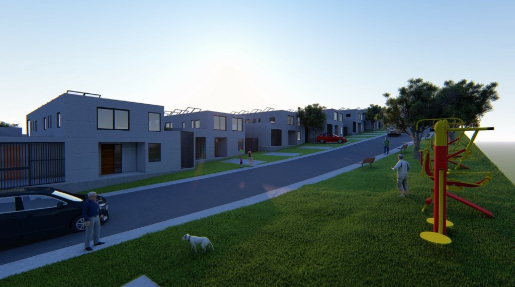 Emplazamiento y Entorno: El condominio se desarrolla en una franja de terreno longitudinal, con las viviendas orientadas hacia una calle interior que permite un alto grado de seguridad y privacidad. Se integran áreas verdes y equipamiento comunitario (como máquinas de ejercicio al aire libre) a lo largo del recorrido.