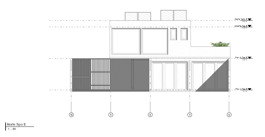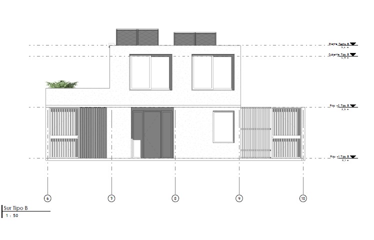 Estética: Fachadas de estilo minimalista, con ventanas estratégicamente ubicadas y un uso predominante de tonos oscuros/grises que confieren solidez y elegancia al conjunto.