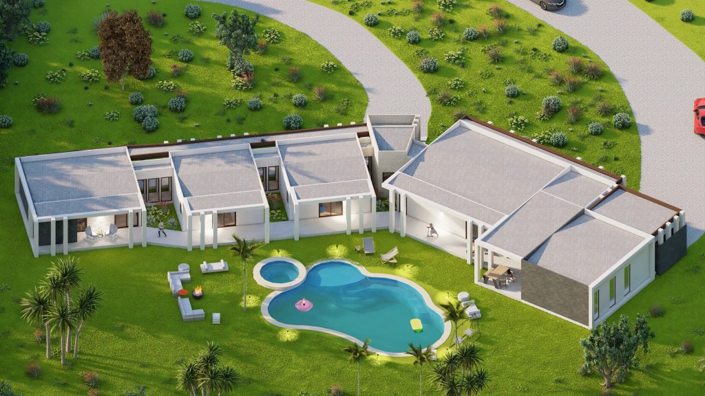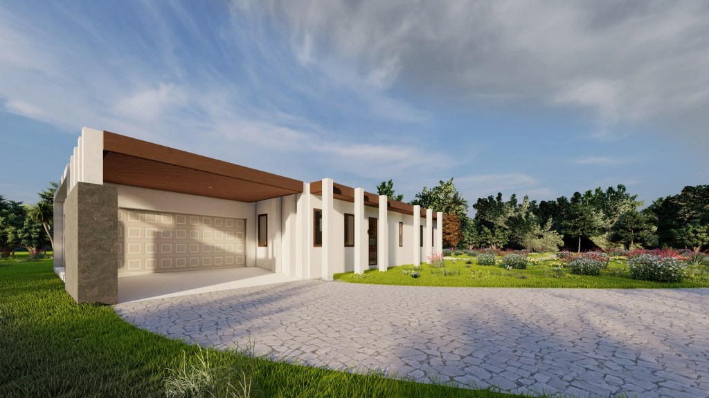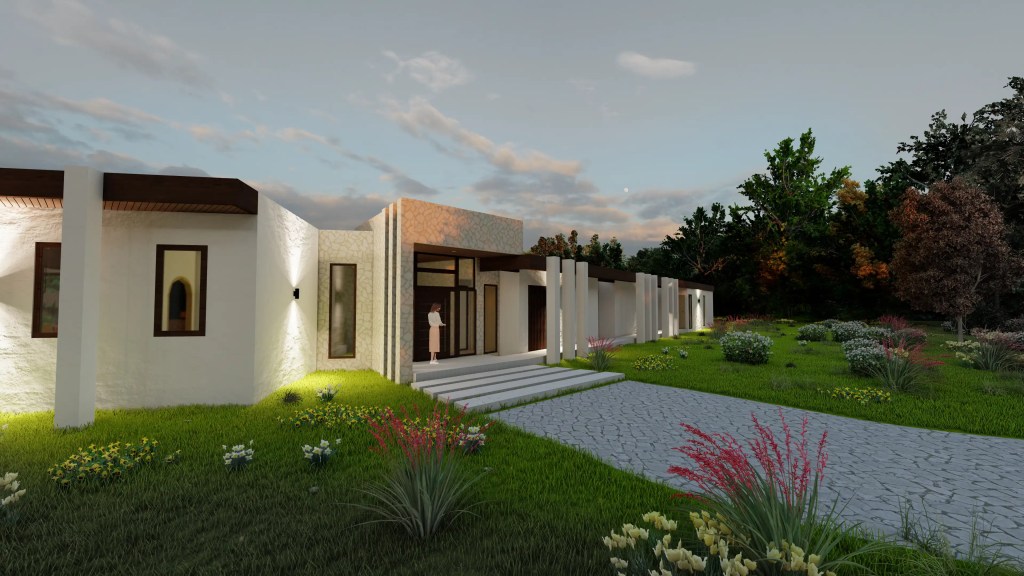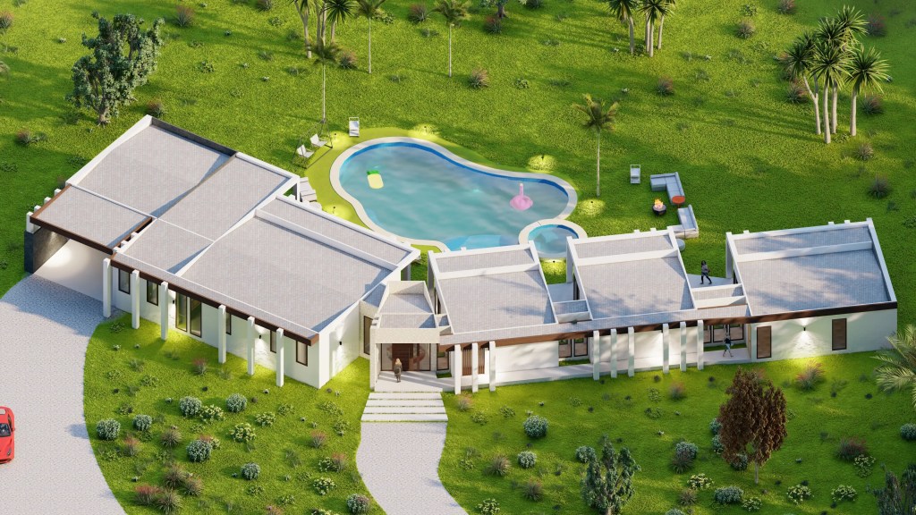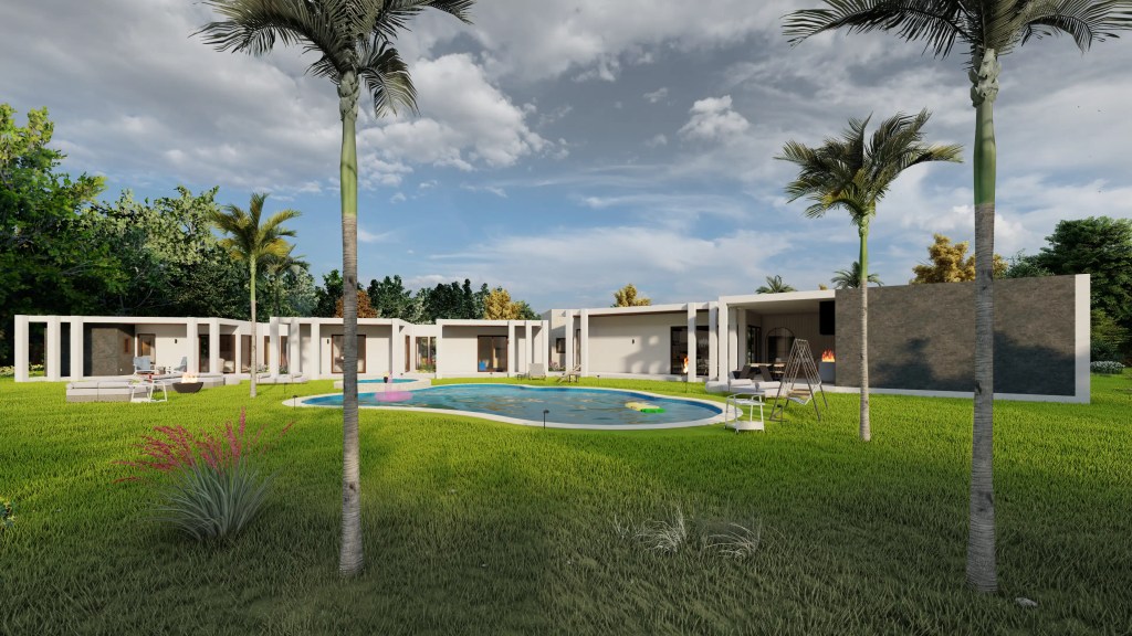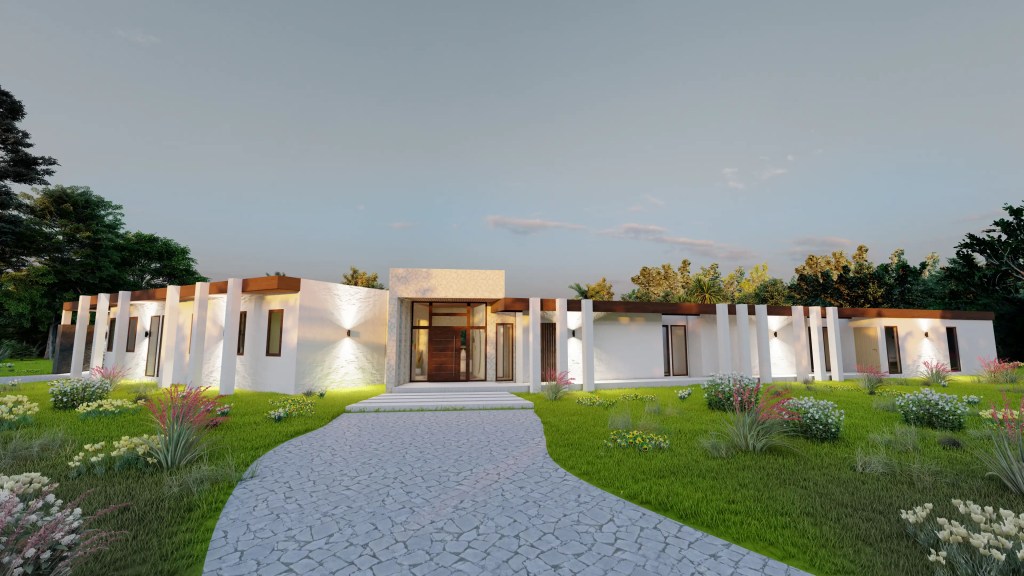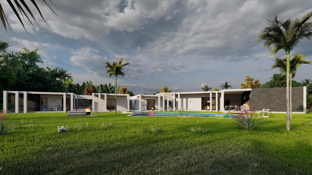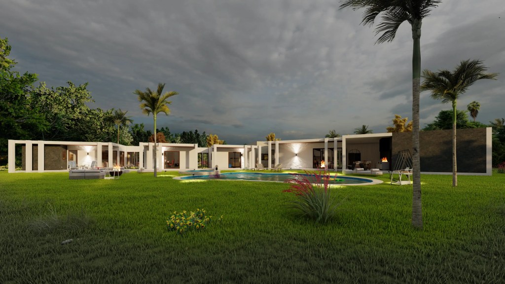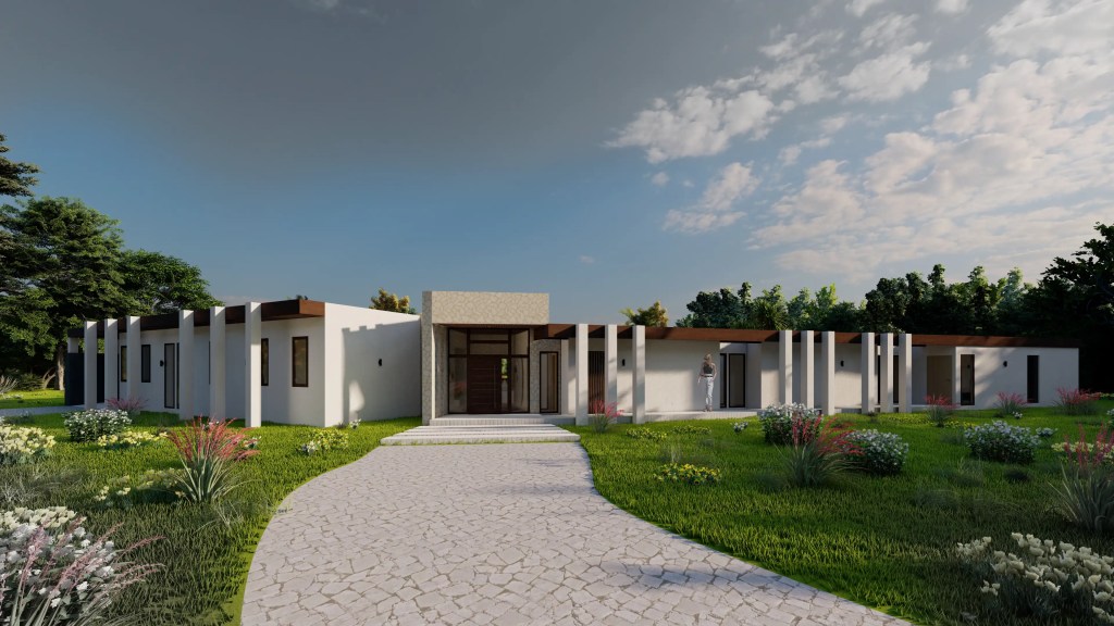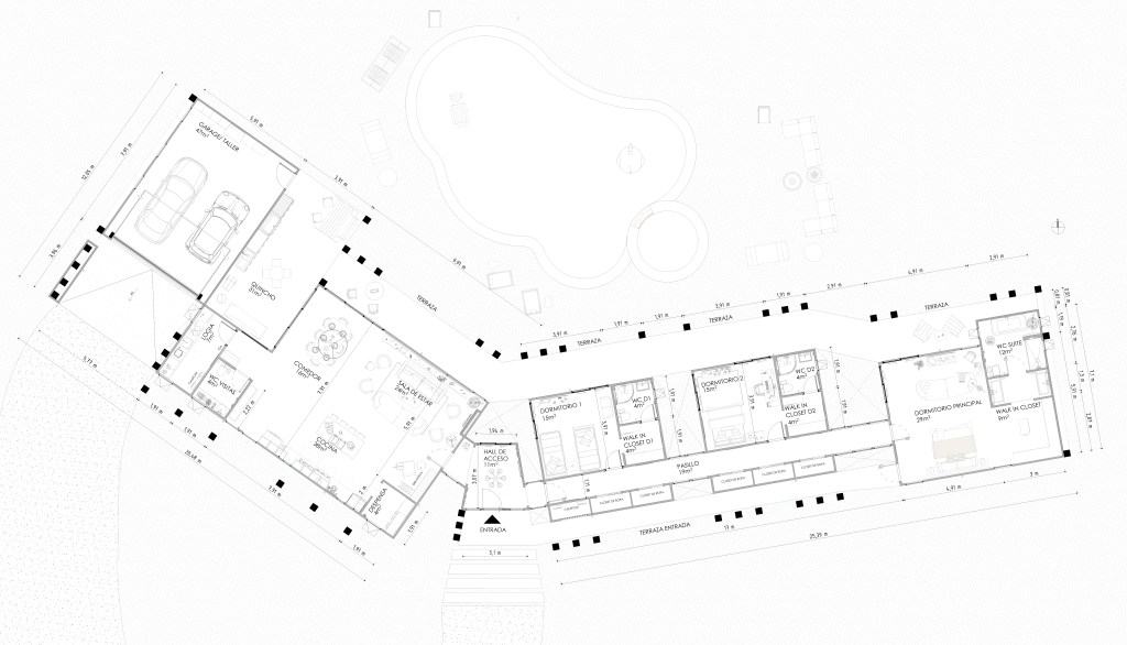 Este proyecto se desarrolla en un extenso terreno y responde a un concepto de arquitectura moderna y horizontal, privilegiando la conexión fluida entre interior y exterior. La planta en forma quebrada permite una integración orgánica con el entorno, generando patios y visuales que enriquecen cada espacio.