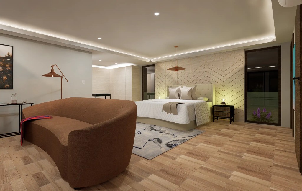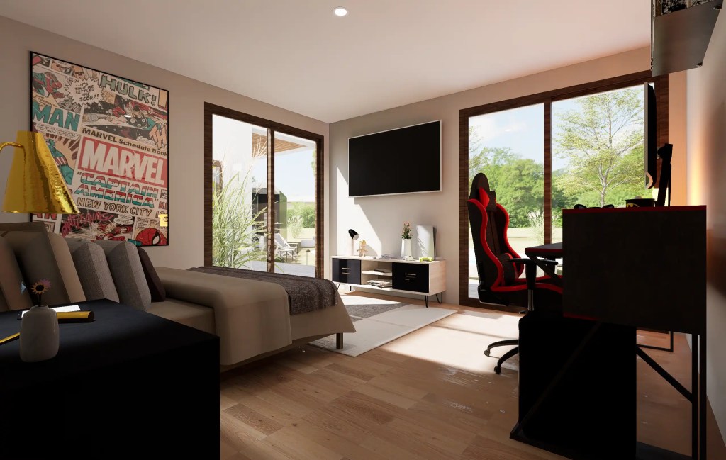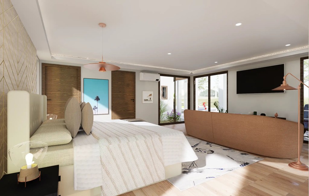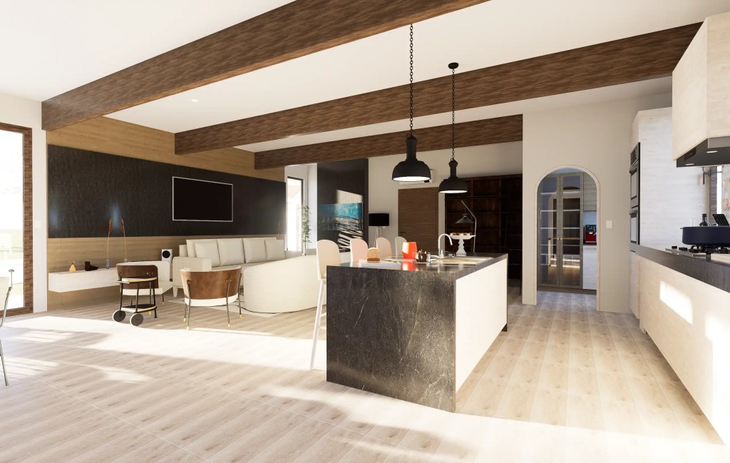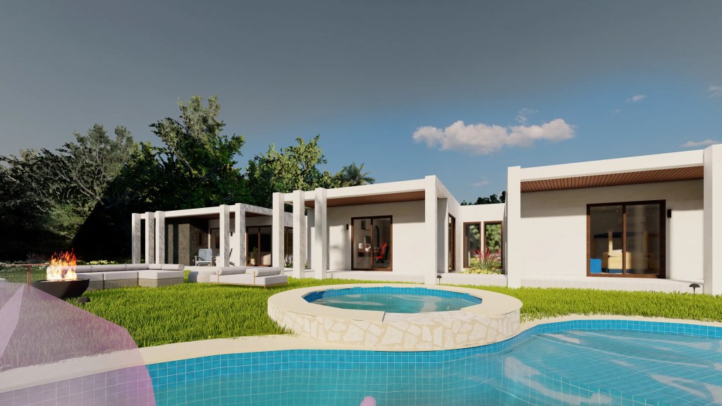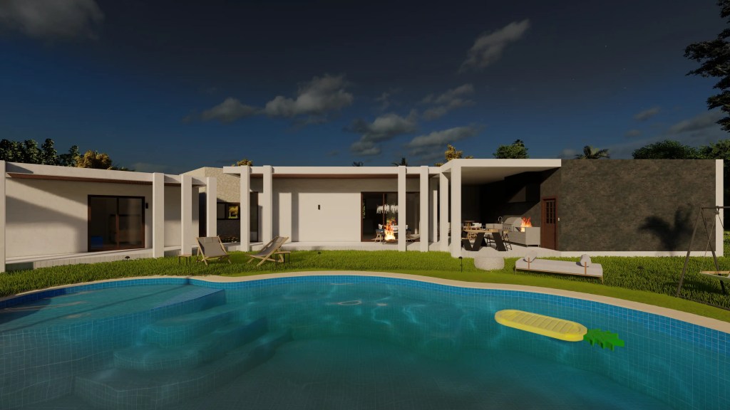 La vivienda se compone de un sector social amplio –living, comedor y cocina integrados– que se abre hacia una gran terraza con piscina de diseño libre, ideal para el uso recreativo. El área privada distribuye tres dormitorios, incluyendo una suite principal con walk-in closet y baño privado, garantizando confort y privacidad.