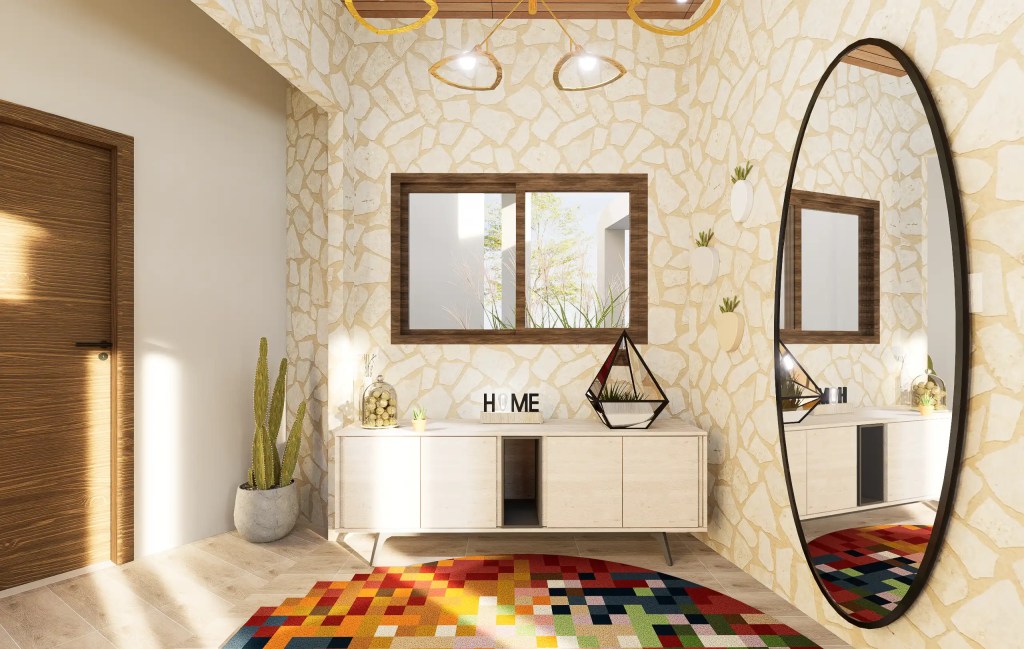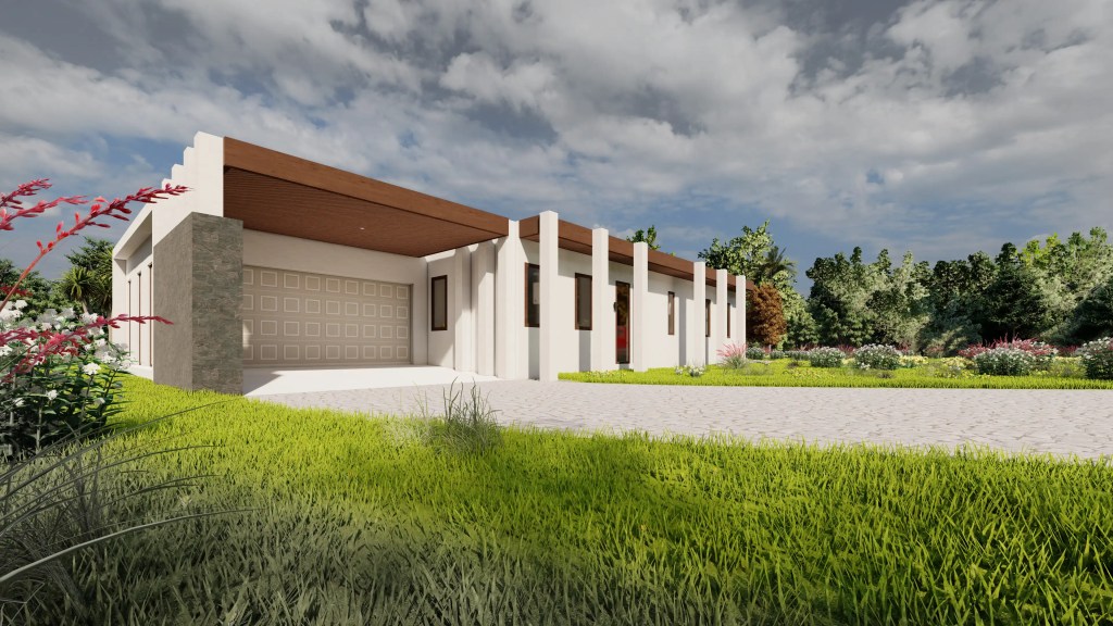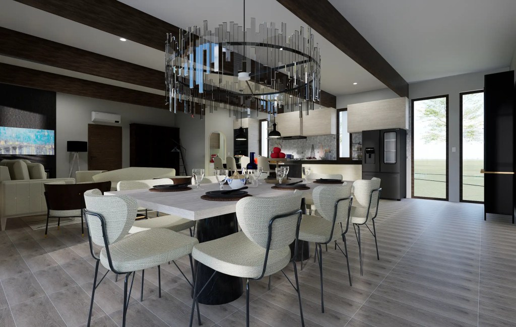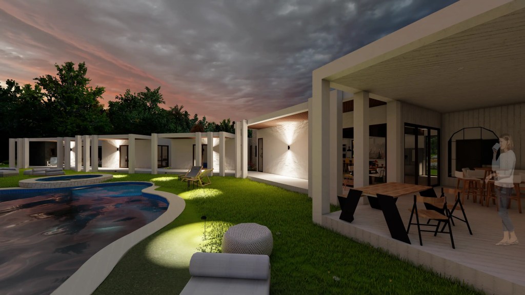 El diseño enfatiza la proporción y la luz natural, incorporando grandes ventanales y pórticos que proyectan sombras dinámicas durante el día. Las líneas rectas, el uso de muros blancos y elementos estructurales expuestos generan un estilo contemporáneo sobrio, mientras que los espacios exteriores –quincho, terrazas y áreas verdes– potencian la vida al aire libre.