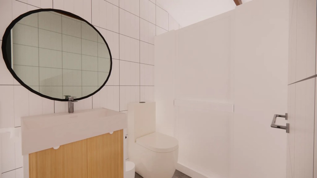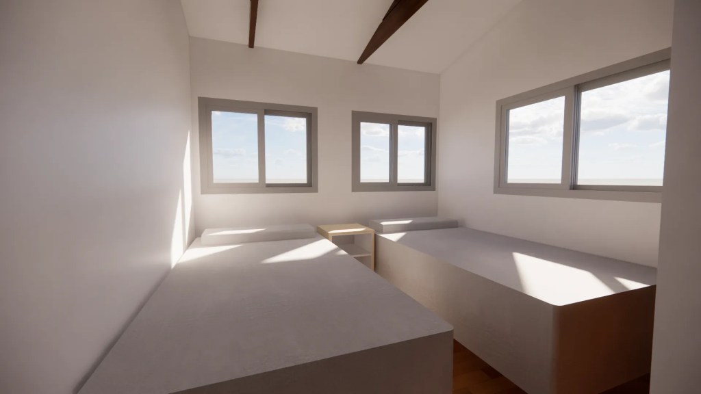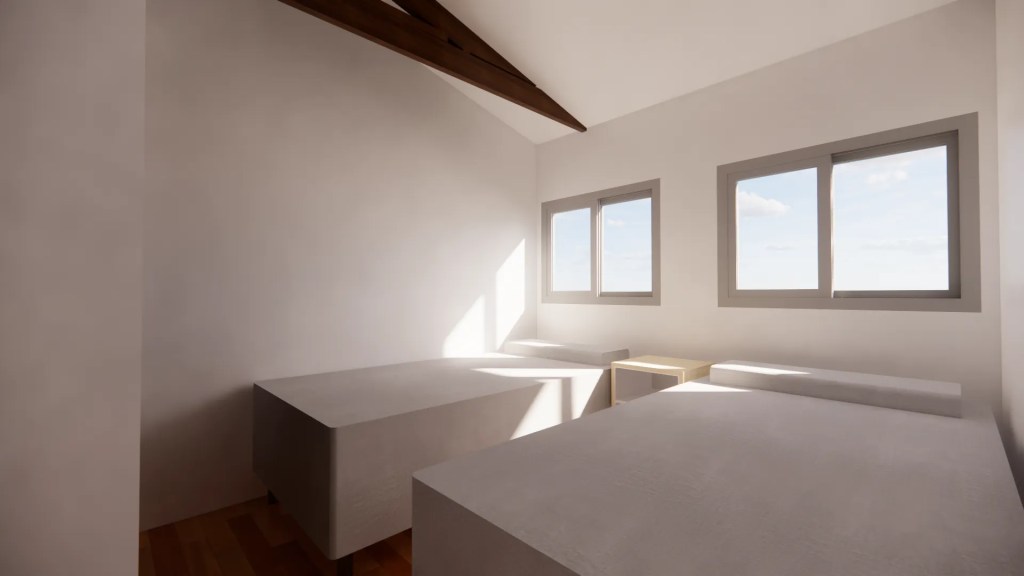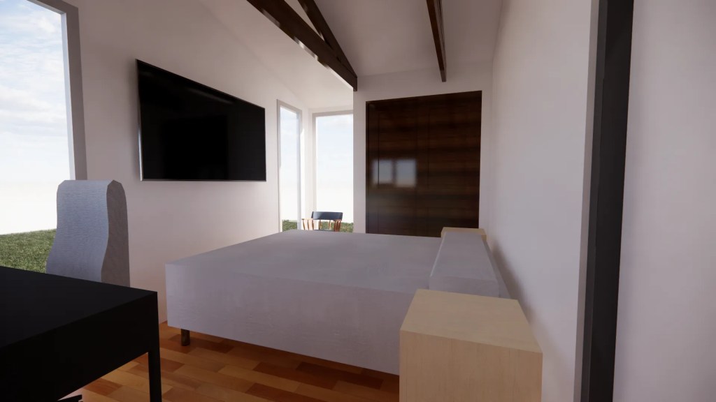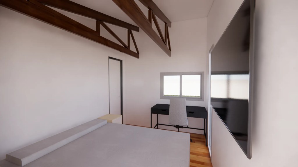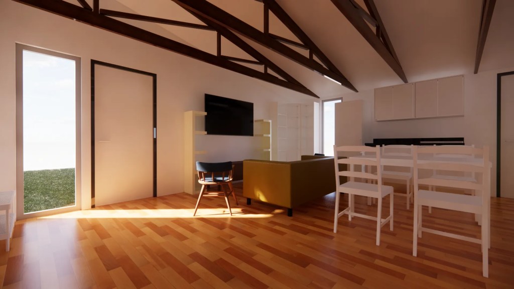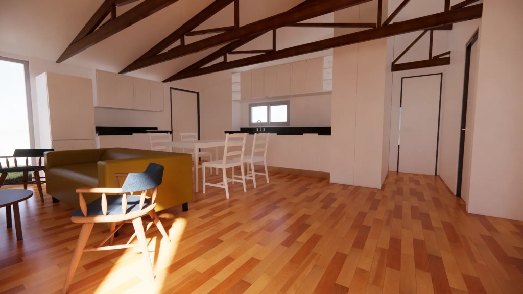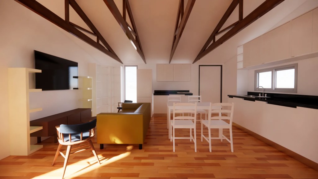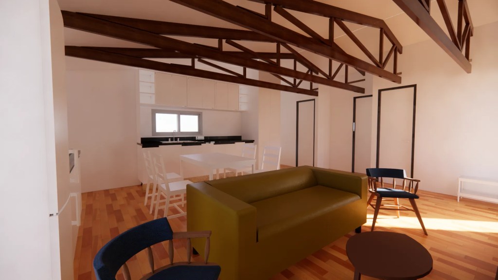 La arquitectura combina la sencillez de una casa de campo con el minimalismo moderno. Se destaca por una estructura de techo a dos aguas que, internamente en el programa común, expone las cerchas metalicas negras, aportando calidez, textura y una gran altura que maximiza la sensación de amplitud.