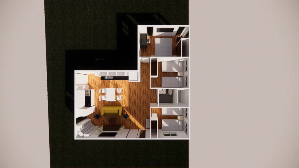 Integración y Vistas: La disposición en forma de «L» no solo optimiza la distribución interna, sino que también permite capturar vistas panorámicas del entorno y genera un patio o área exterior central protegida.