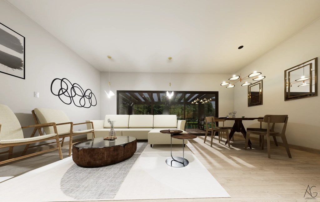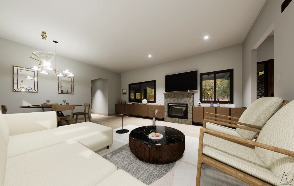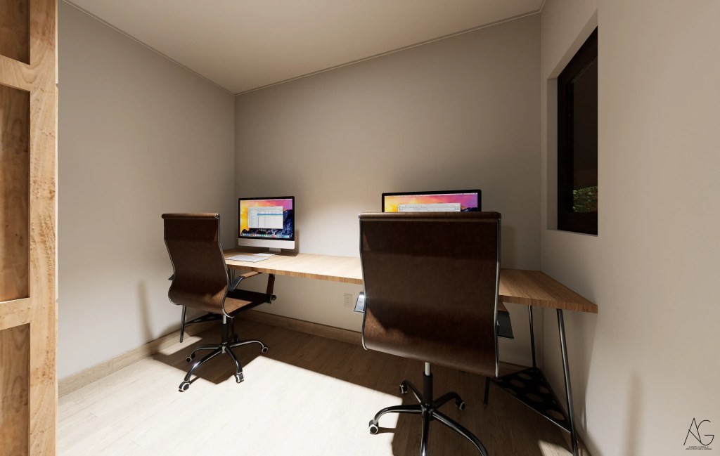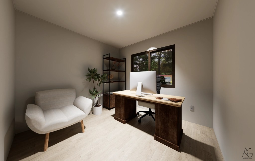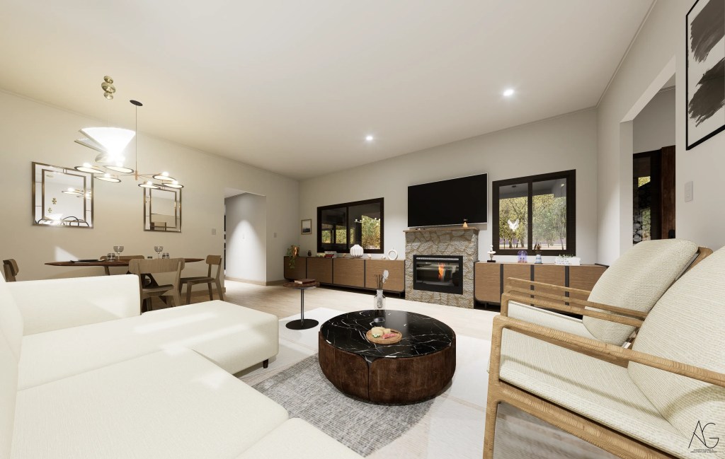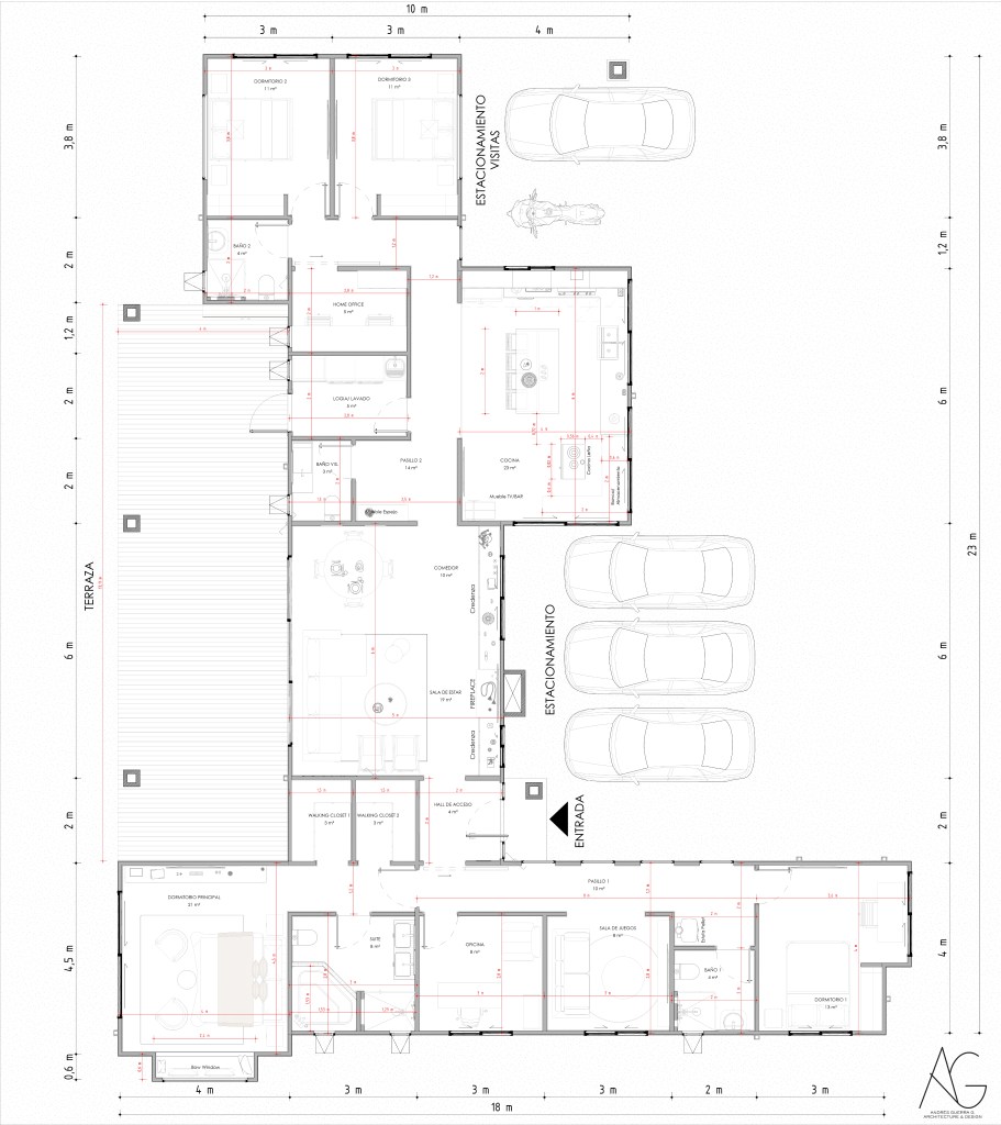 La casa se desarrolla en un solo nivel, favoreciendo la accesibilidad y la integración directa con el entorno. Su distribución en planta en forma de “L” permite separar de manera eficiente las áreas privadas y sociales, otorgando independencia a los dormitorios y amplitud a los espacios comunes, como el living-comedor conectado a una amplia terraza.