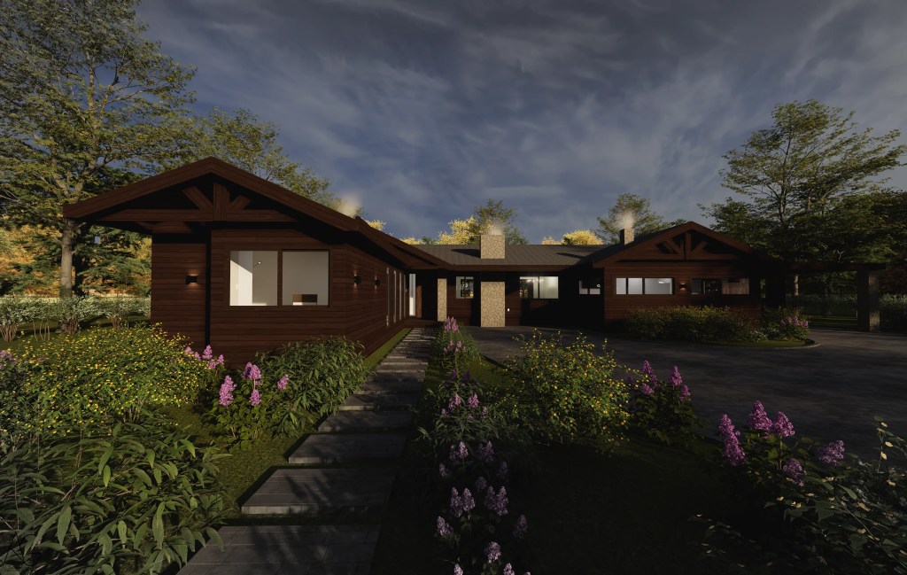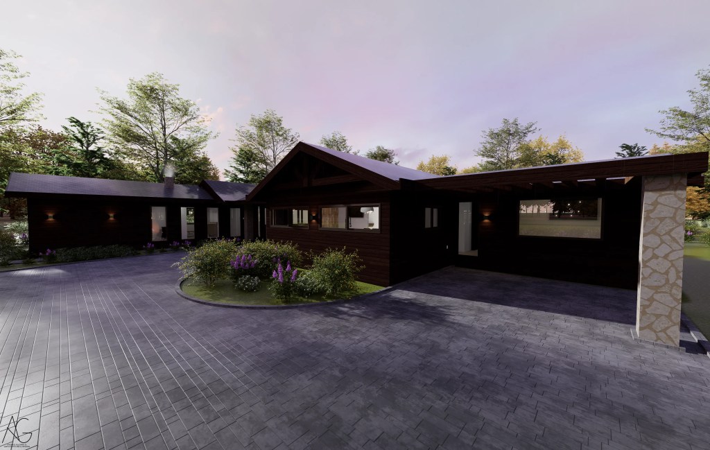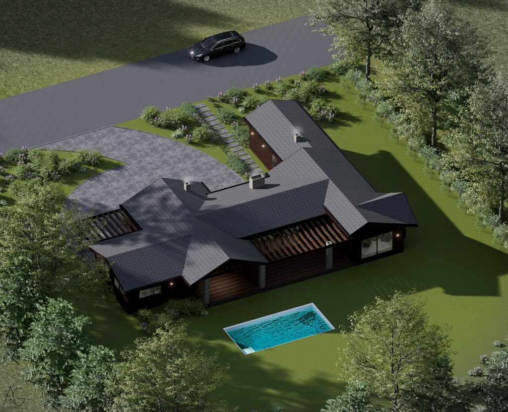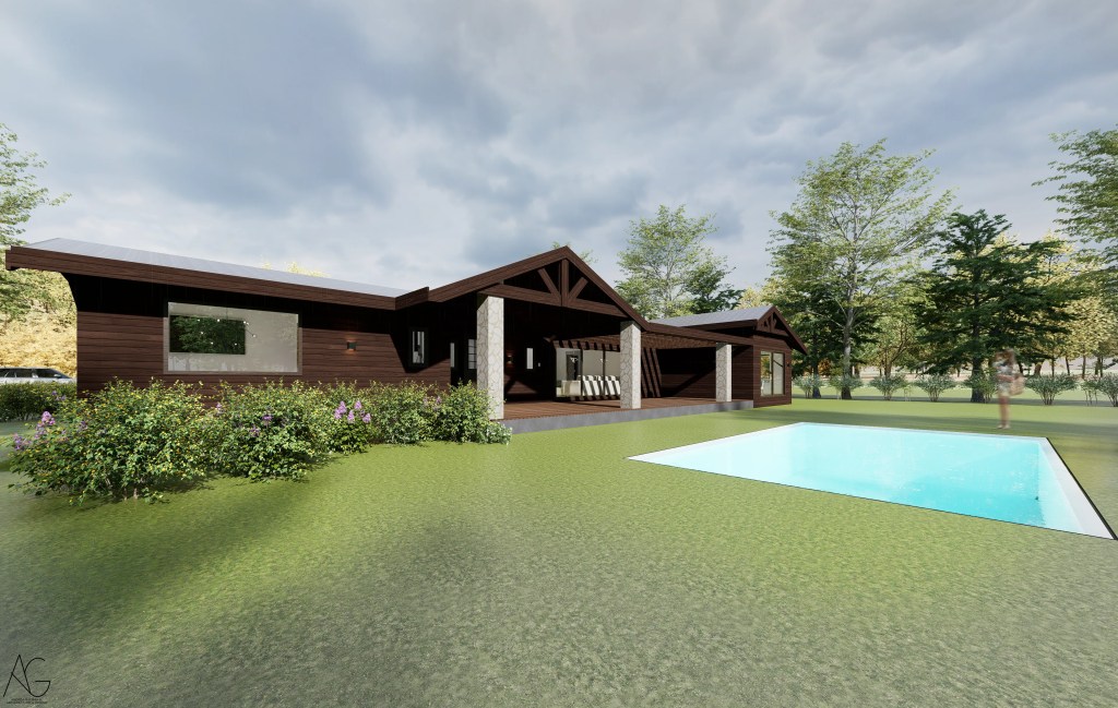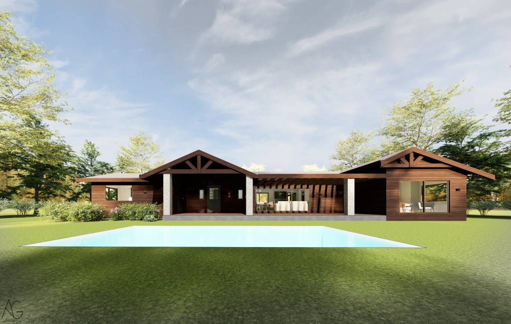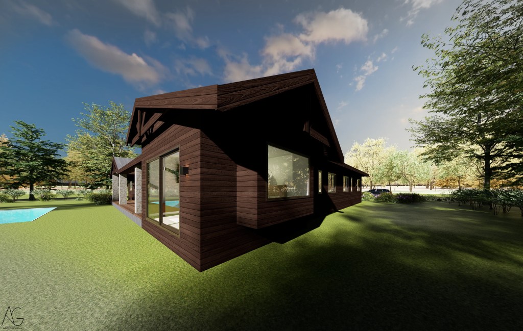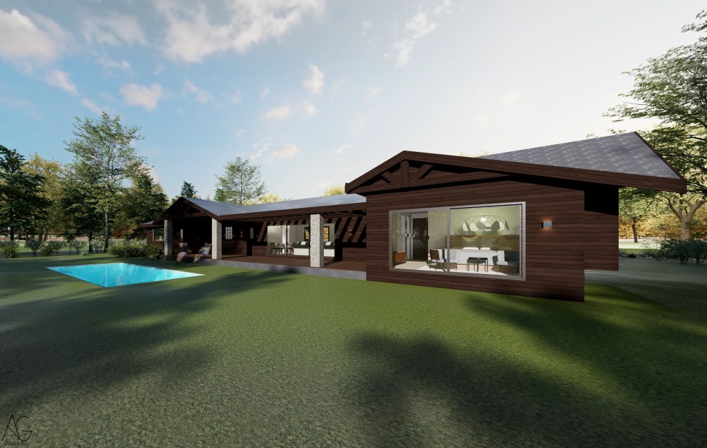 La materialidad destaca el uso de revestimientos en madera oscura, cubiertas inclinadas y elementos en piedra en pórticos, evocando la arquitectura tradicional, pero incorporando grandes ventanales que aportan luz natural y vistas hacia el jardín y la piscina.