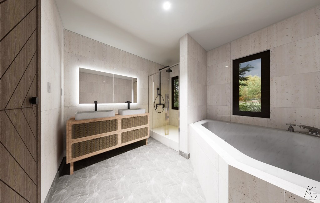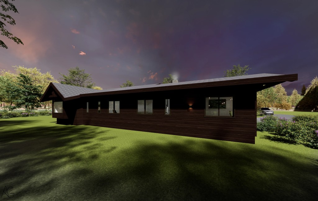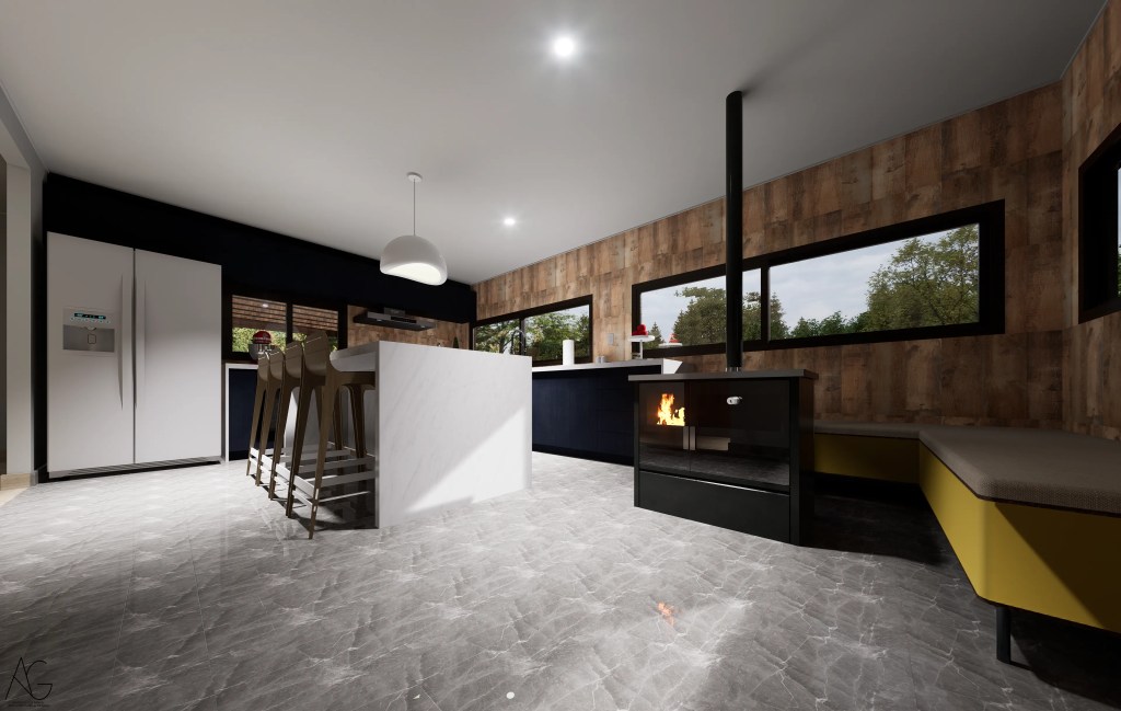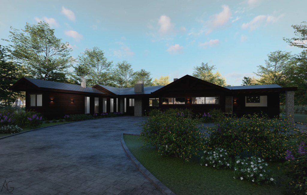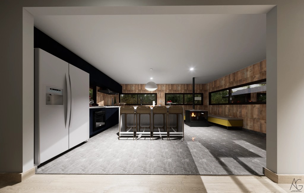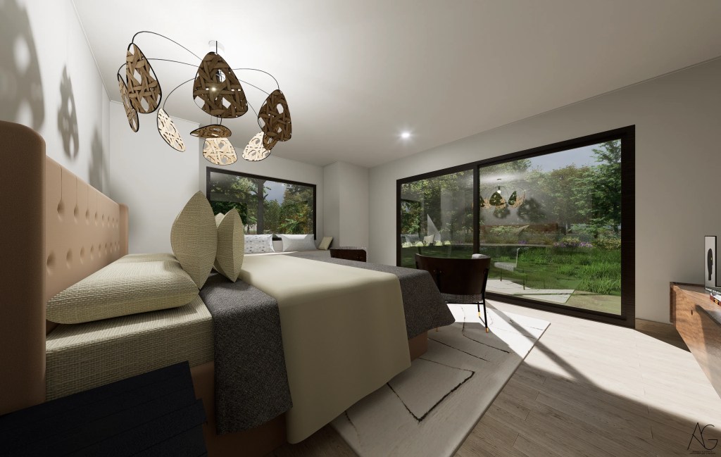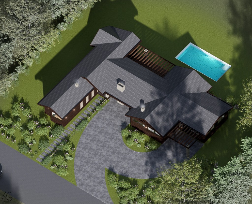 La materialidad destaca el uso de revestimientos en madera oscura, cubiertas inclinadas y elementos en piedra en pórticos, evocando la arquitectura tradicional, pero incorporando grandes ventanales que aportan luz natural y vistas hacia el jardín y la piscina.