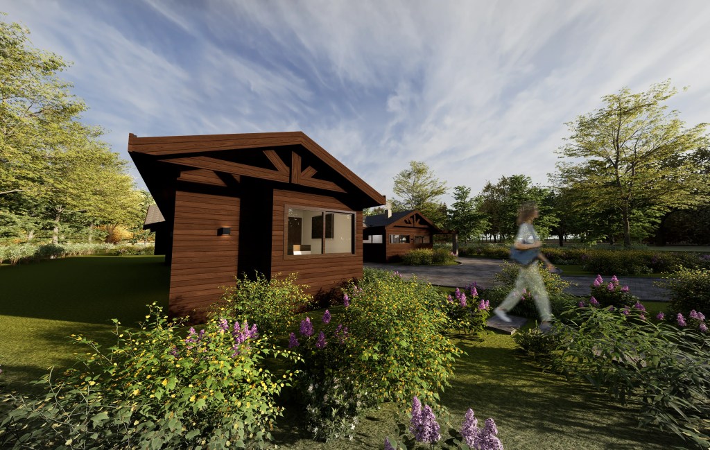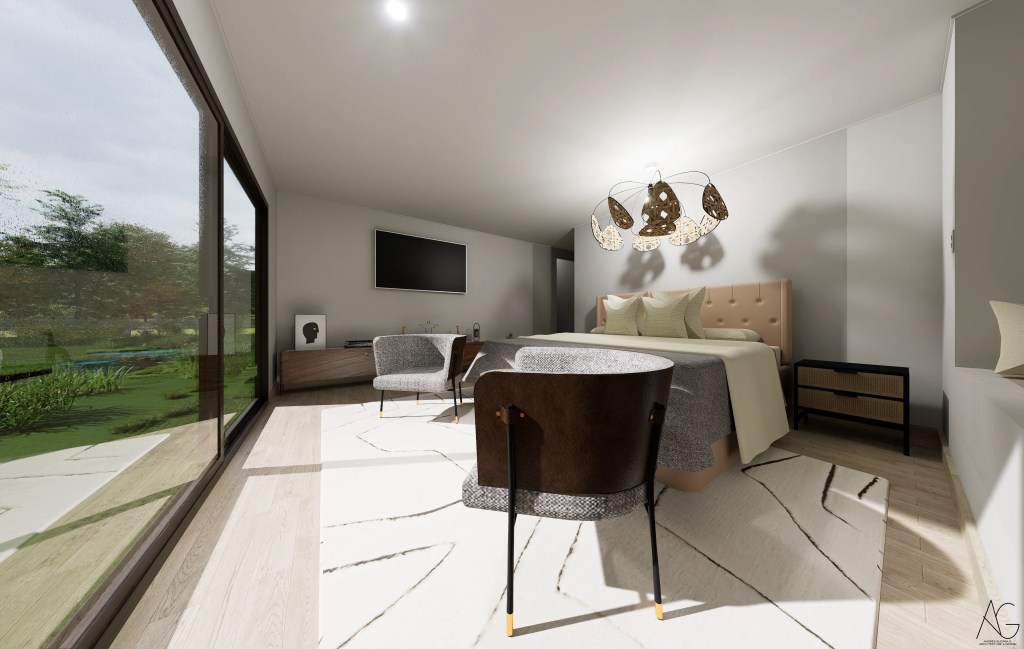 El diseño exterior integra senderos, estacionamientos y un paisajismo que refuerza el carácter campestre del proyecto, mientras que la piscina se posiciona como un punto focal para el esparcimiento y la vida al aire libre.