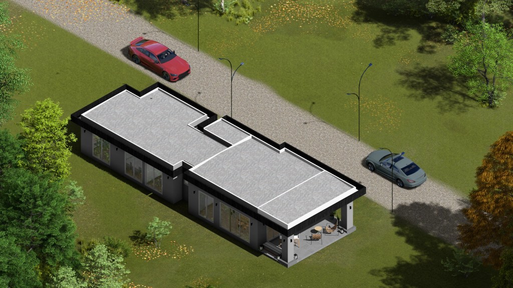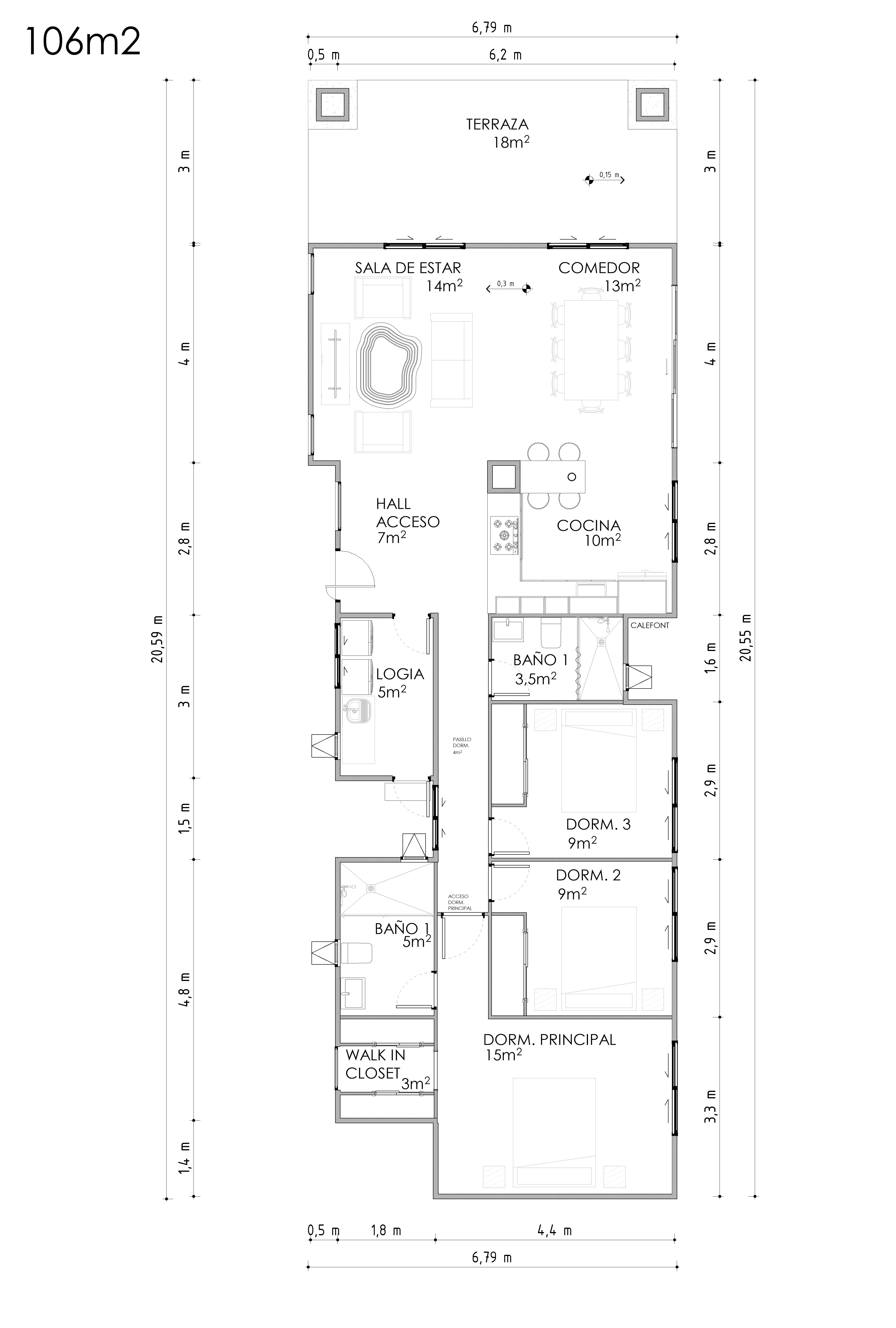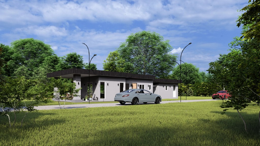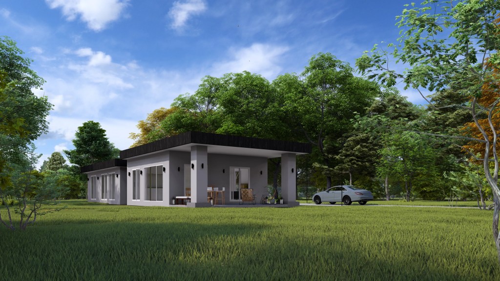 El programa contempla tres dormitorios, dos baños, cocina integrada, logia y una amplia zona común que vincula el estar, comedor y terraza, extendiendo el espacio social hacia el jardín. Su cubierta plana y líneas simples destacan la horizontalidad del volumen, mientras que el contraste entre muros claros y detalles en tonos oscuros refuerza su carácter contemporáneo.
