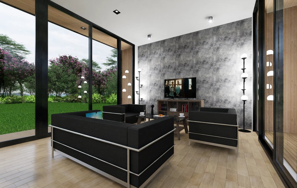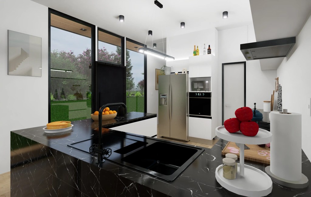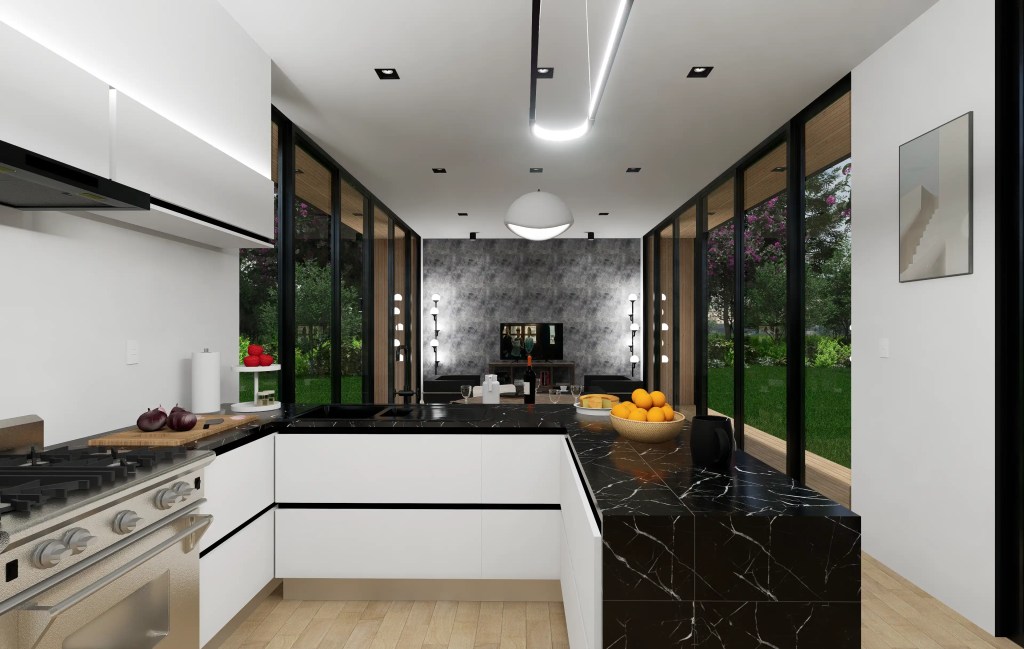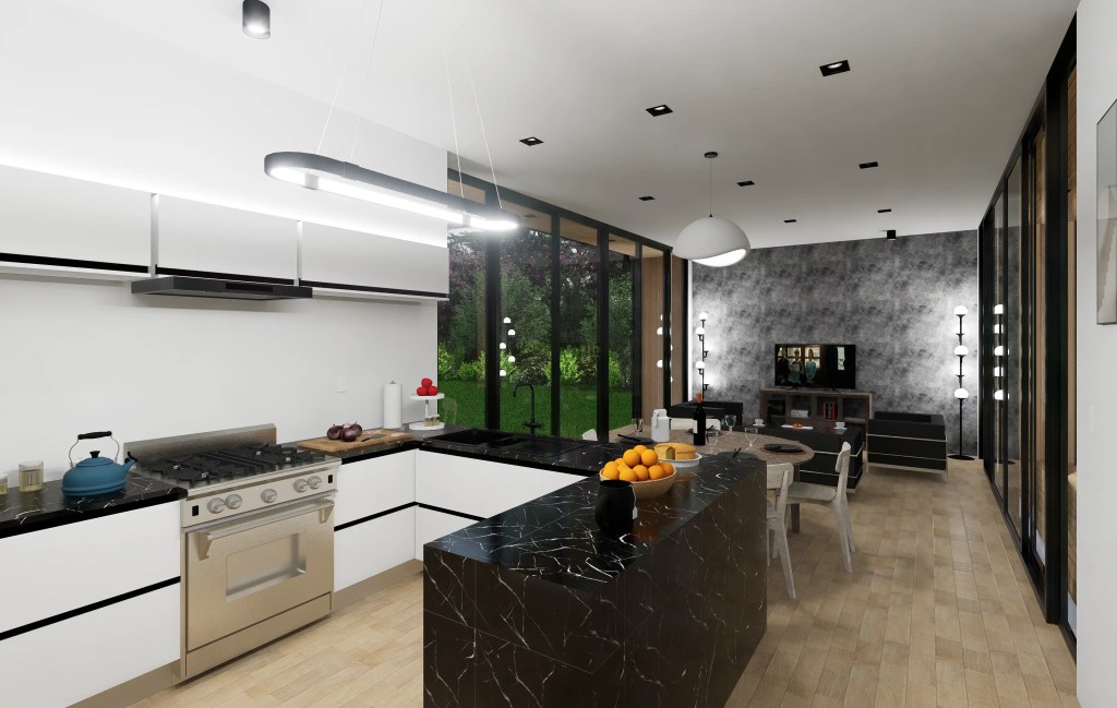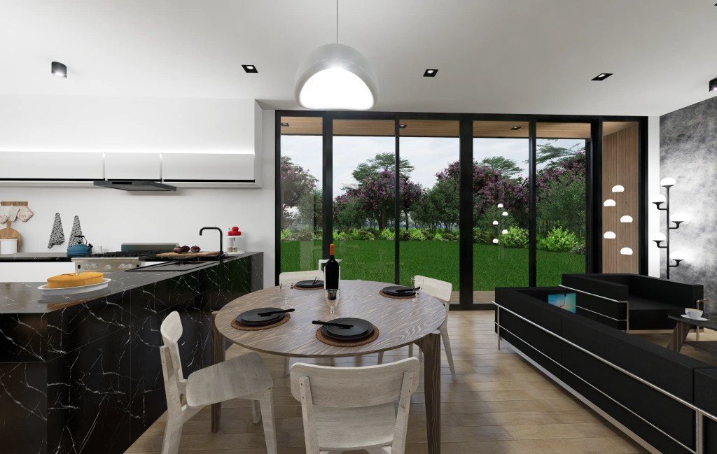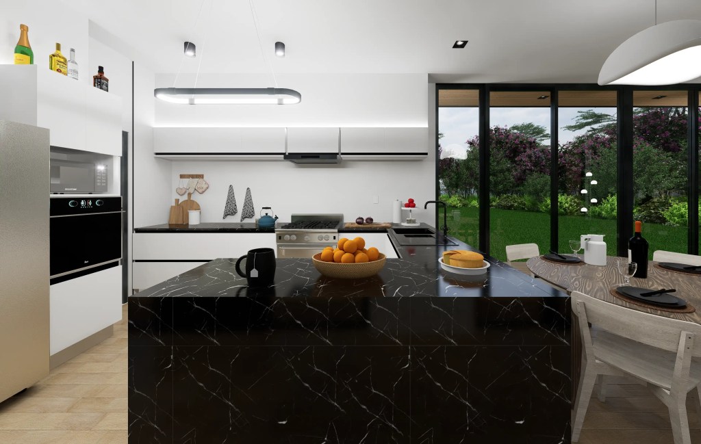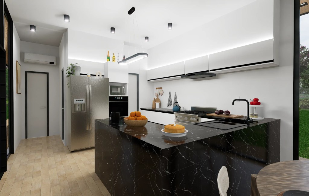 –Zona Social: Un espacio abierto y continuo que integra la Sala de Estar, el Comedor y una Cocina de diseño moderno (con encimeras oscuras tipo mármol y muebles minimalistas), ideal para la vida social.