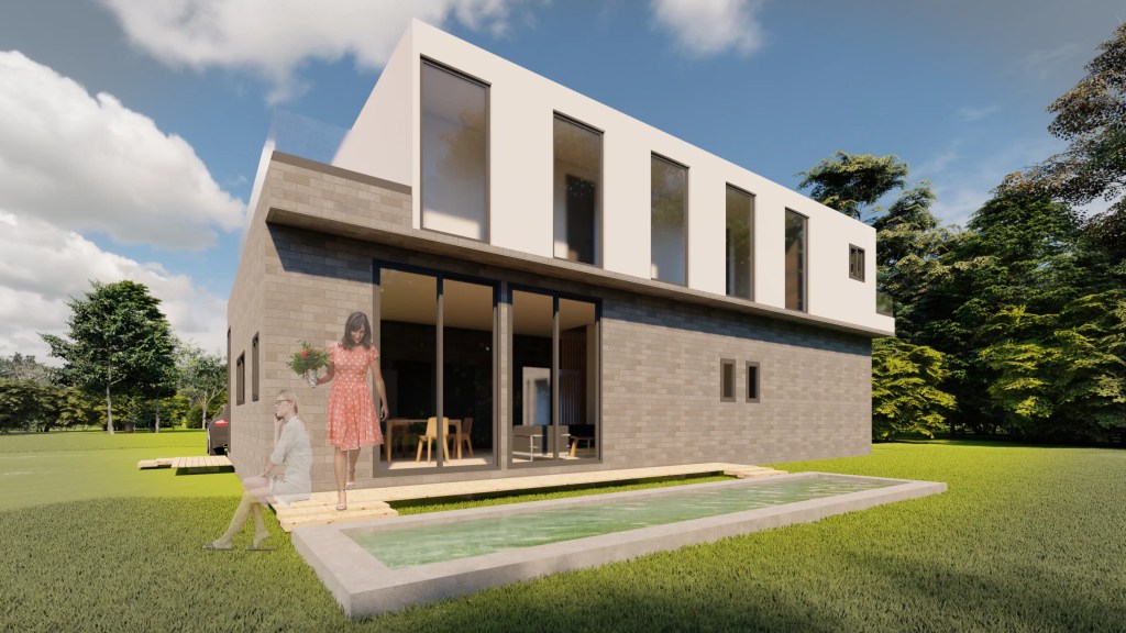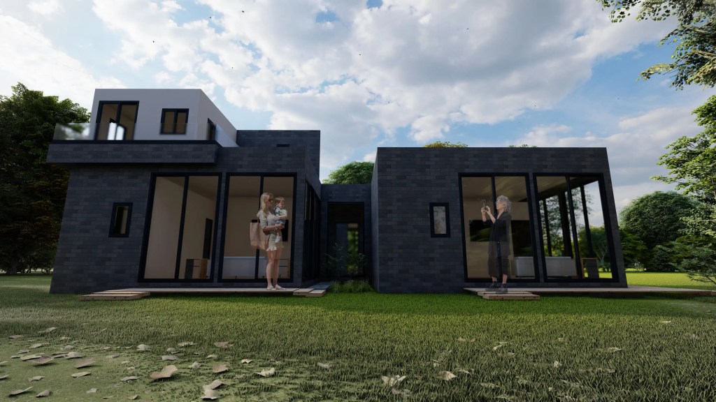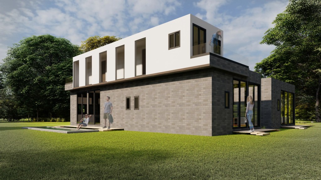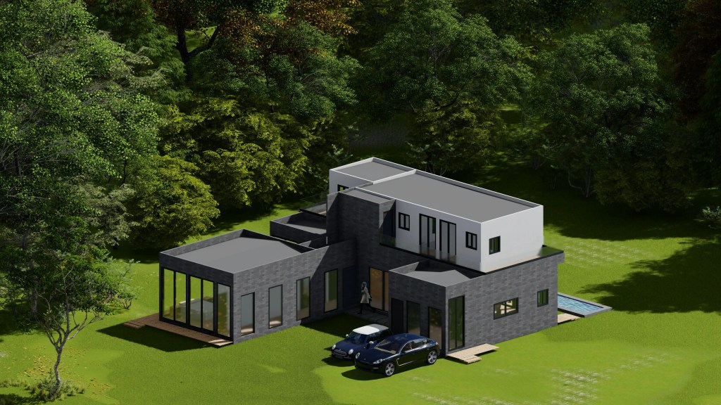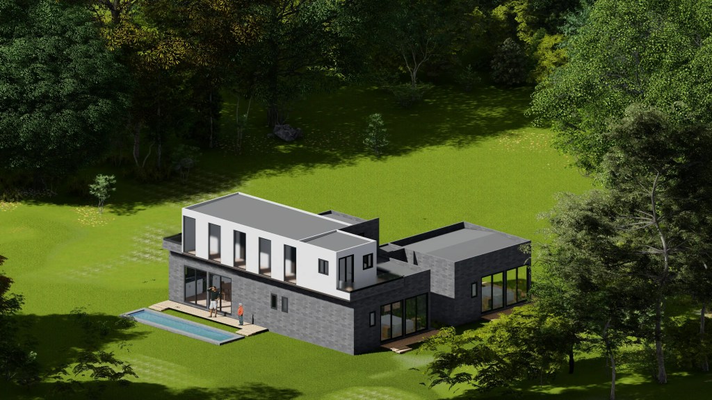 Esta vivienda moderna de dos niveles se caracteriza por su volumetría limpia y la combinación armónica de tonos neutros y materiales contemporáneos. El diseño se organiza en torno a un esquema en “L” que favorece la privacidad de las áreas íntimas y una fuerte conexión visual con el entorno natural.