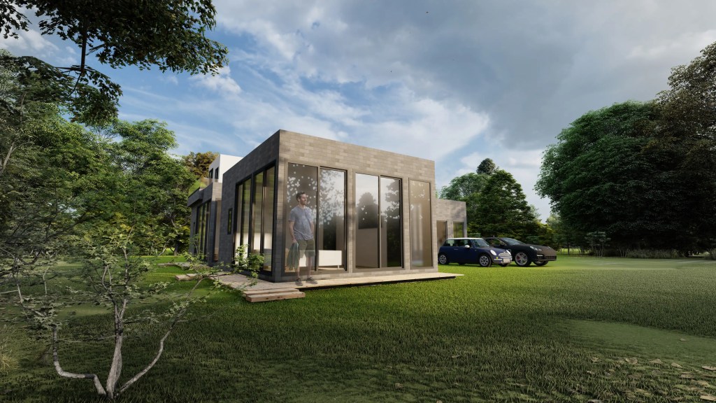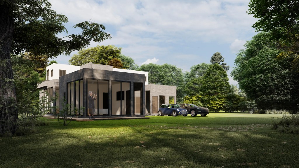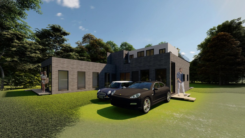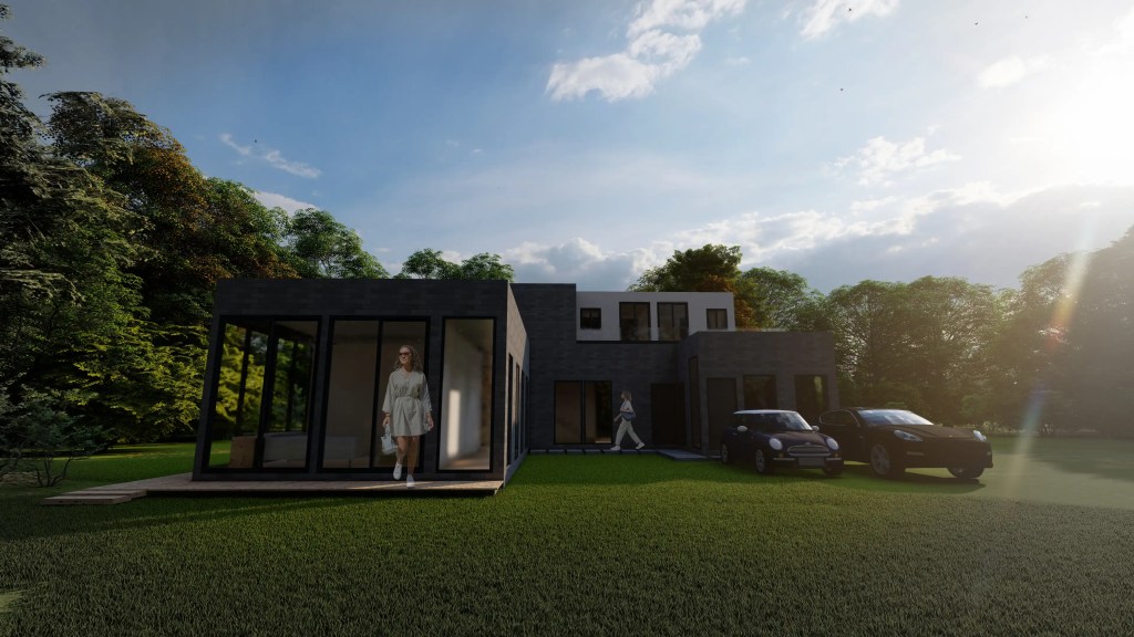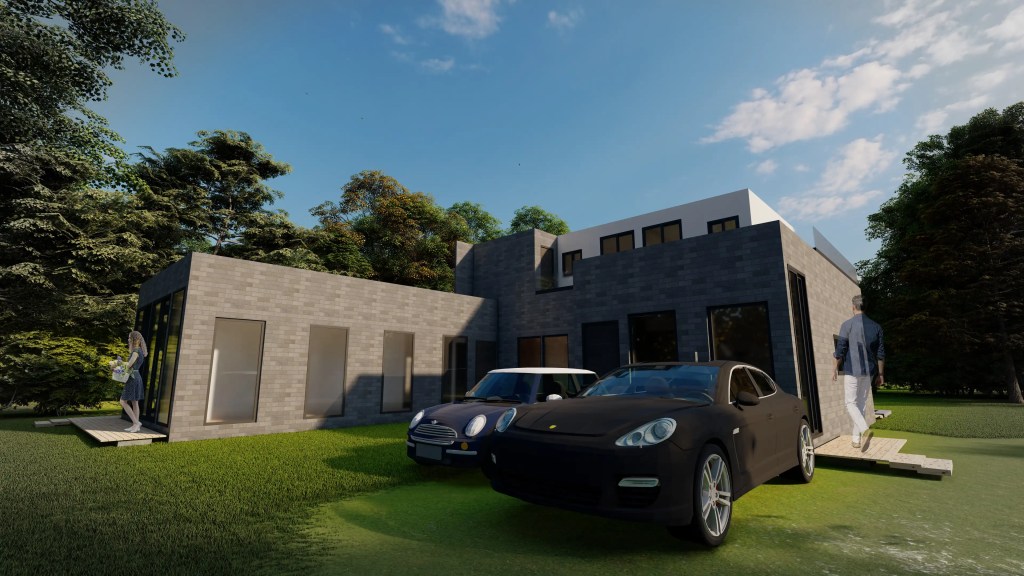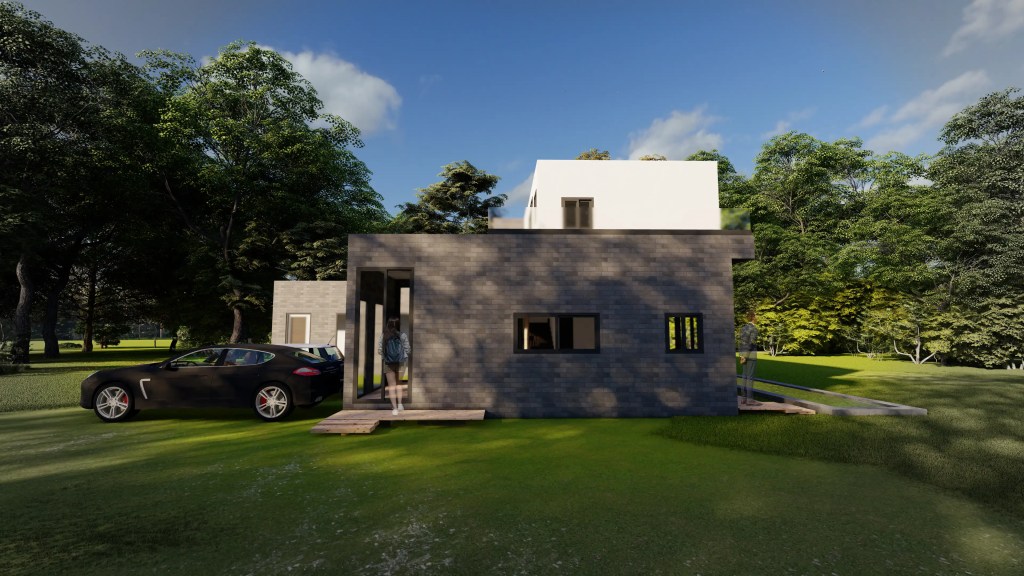 Esta vivienda moderna de dos niveles se caracteriza por su volumetría limpia y la combinación armónica de tonos neutros y materiales contemporáneos. El diseño se organiza en torno a un esquema en “L” que favorece la privacidad de las áreas íntimas y una fuerte conexión visual con el entorno natural.