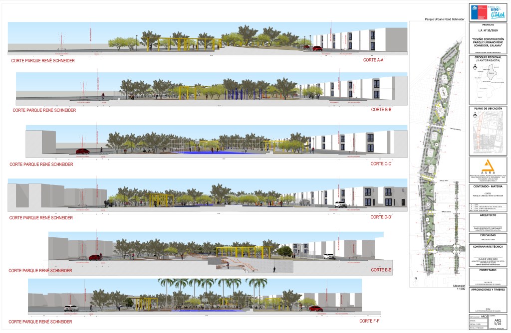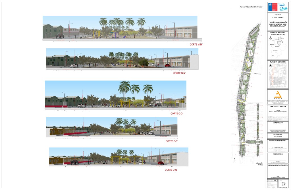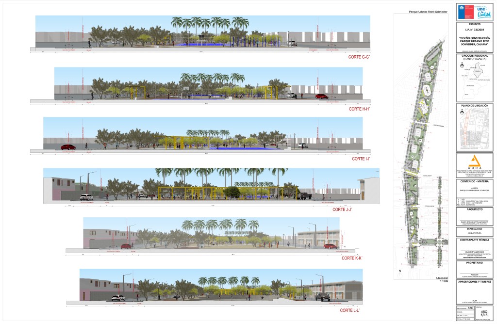 Diseño y creación ex novo (desde cero) de un parque urbano longitudinal. El proyecto tiene como objetivo establecer un nuevo espacio público esencial para la comunidad de Calama, transformando un terreno en un punto de encuentro y recreación.
