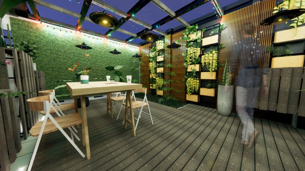 - Estilo Industrial/Moderno: Pintura de la estructura metálica en tonos oscuros y adición de iluminación colgante tipo industrial (lámparas UFO y guirnaldas) para un toque moderno y acogedor, ideal para uso diurno y nocturno.